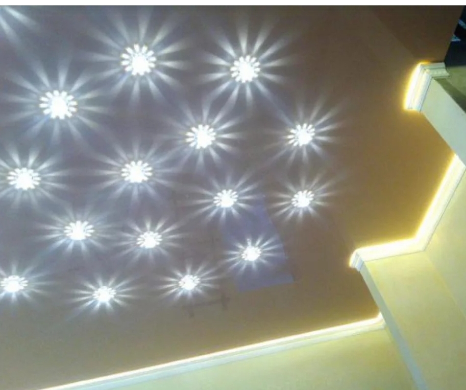 Итак, огромное количество маленьких врезных светильников-точек на потолке визуально перегружает потолок и дает переизбыток света в конкретной области. Ромашки хороши, когда они на поле).